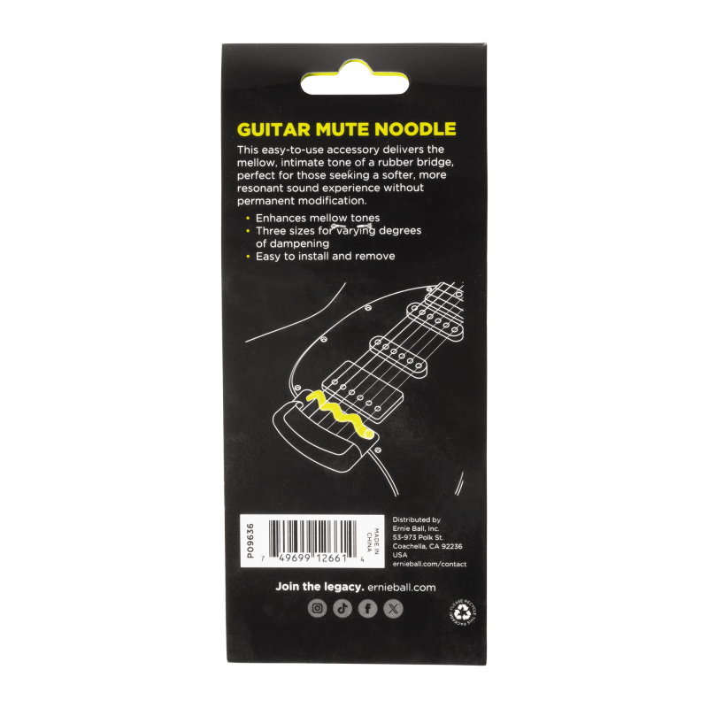 Ernie Ball Mute Noodle за китара е лесен за употреба аксесоар, предназначен да се постави между струните при моста (магарето) на китарата, емулирайки топлото, интимно звучене на гумен мост. Той е перфектният избор за хора, които желаят по-резонантен, по-нежен звук, без нужда от трайна модификация.